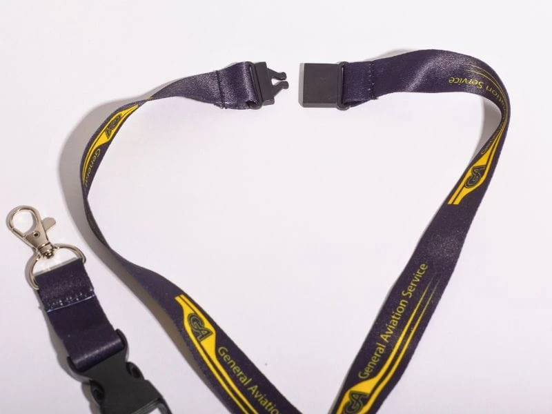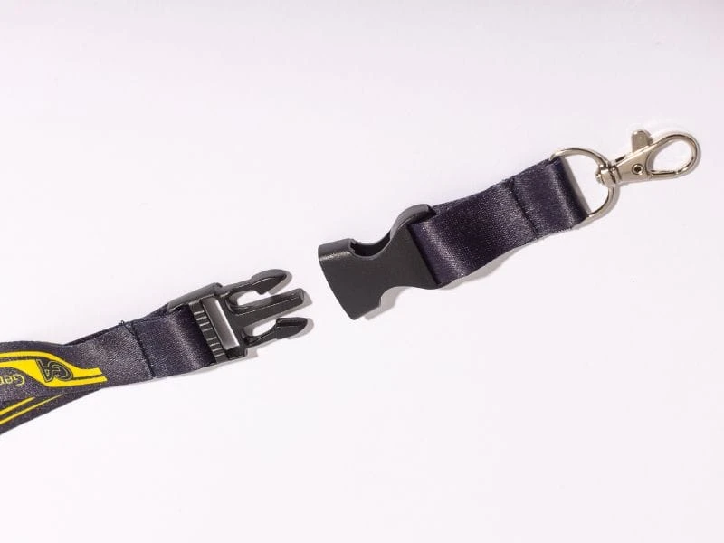 Aquí hay un ejemplo de un lanyard personalizado con cierre trasero por Wyapromo: