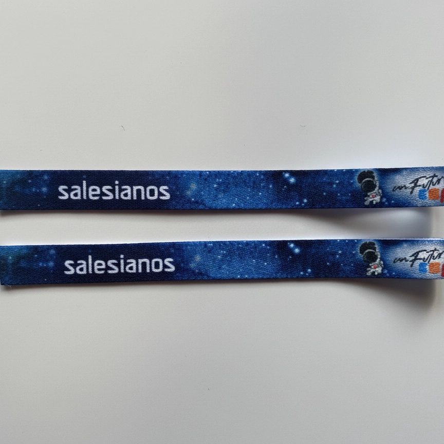 Pulseras de tela sublimadas a todo color con impresión nítida y tacto satinado. Su superficie completa permite plasmar logotipos, textos o diseños con máxima libertad cromática, perfectas para campañas publicitarias o eventos.